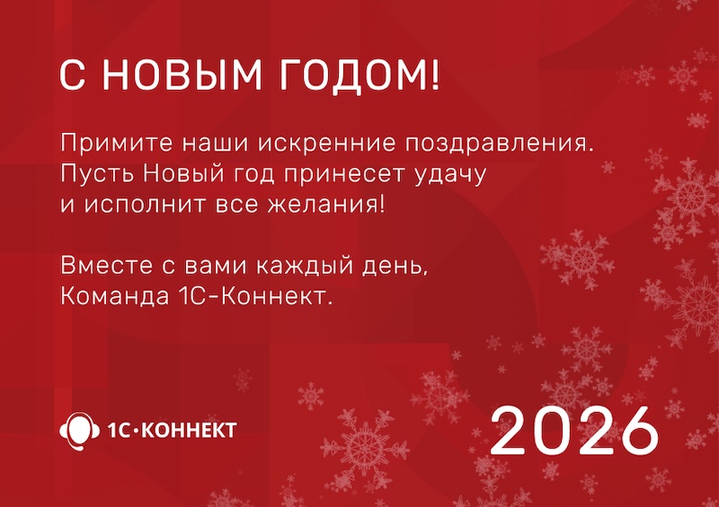 В связи с Новогодними каникулами, техподдержка сервиса 1С-Коннект и работа с партнерами 30 декабря 2025 года будут работать в штатном режиме. С 31 декабря по 11 января — выходные дни, наша команда уходит на новогодние каникулы. Все поступившие в этот период обращения будут обработаны 12 января 2026 года.