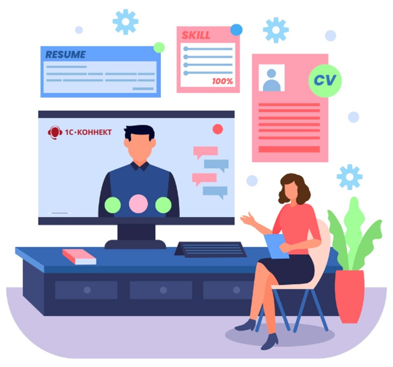 В зависимости от потока кандидатов и сложности вакансии, мы рекомендуем внедрить в компании трекер учета (или HRM-систему), а также использовать современные средства коммуникации. В частности, 1С-Коннект со встроенными видеозвонками и подключением по ссылке, сэкономит время при организации первичных контактов и предоставлении обратной связи, а также поможет проводить собеседования с кандидатами из других городов. При использовании видеозвонков в 1С-Коннект в компании остается запись и автоматическое AI-резюме.