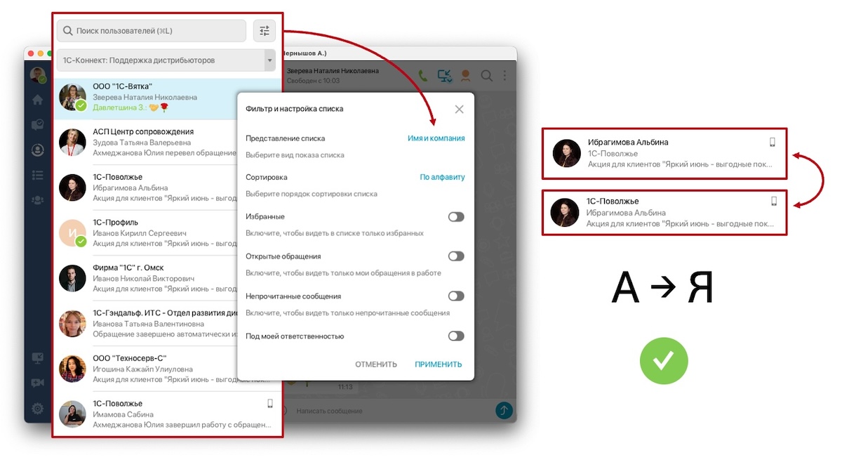 В приложении 1С-Коннект для компьютера (начиная с версии 5.3.8.1422) расширены варианты сортировки списка, модернизировано представление контактов, фильтр и поиск.